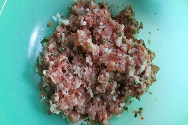 Thịt nạc vai: Rửa sạch, thái nhỏ sau đó xay nhuyễn. Xay xong, đem băm chung với phần thịt tôm vừa thực hiện trước đó.