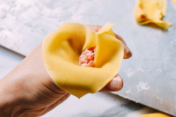Đặt một bát nước lọc bên cạnh. Dùng một chiếc thìa cafe sau đó múc phần nhân đã được vào giữa lá hoành thánh. Làm ướt hai mép lá hoành thánh sau đó gấp lại với nhau.